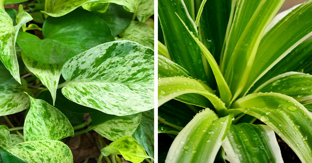 Spider Plants are another great beginner plant. They’re tough as nails, and can also grow well in reasonably low-light. They do like bright indirect light if it’s available, but they don’t love the direct sun. Our favourite is the variegated version with a white stripe down the center of its long leaves.