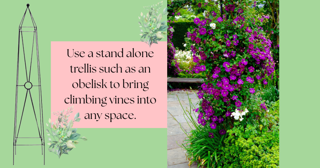 Now, you wondering how you will fit all these creeping vines into your yard. Some can be planted into containers, such as clematis and honeysuckle, allowing you to move them if needed. If you have limited areas where plants can climb on arbors, walls, or trees, consider using obelisks. Obelisks are free standing trellises which you can use for climbing roses, clematis, honeysuckle, and trumpet vine. Heavier vines will need the support of a wall or tree such as climbing hydrangea and wisteria.