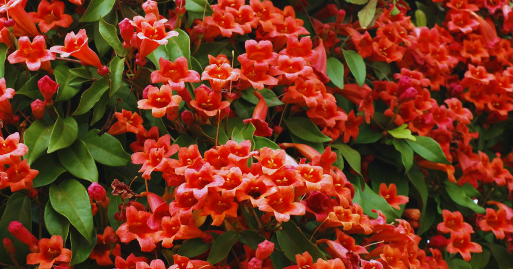 Trumpet vines will produce clusters of trumpet shaped flowers which are an absolute favorite of pollinators, particularly hummingbirds. These beauties will produce masses of flowers all summer long, but keep your pruners handy as they can easily take over an area and grow out of control!